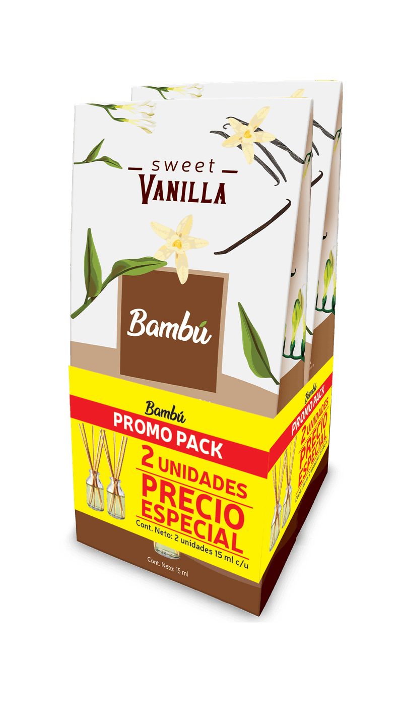 Difusor de esencia tipo bambú con aroma VAINILLA DULCE; 15 ml. Ideal para aromatizar baños, closets, dormitorios, oficinas, locales comerciales y demás lugares. Incluye: varitas difusoras y 1 botella decorativa. Pack x 2 unidades. Medidas del producto (Alt+Anch+Prof): 7 x 3 x 3 cm TIPS