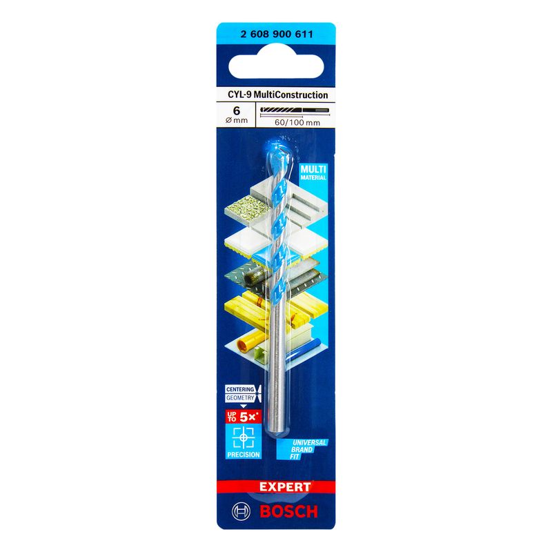Broca multiconstrucción de 6 mm. Ideal para perforar con precisión en múltiples materiales como concreto suave, granito, cerámica, madera, plástico y aluminio. Su punta de centrado especial asegura inicios exactos, mientras su filo afilado y carburo optimizado garantizan durabilidad y resistencia al desgaste. Compatible con cualquier taladro o atornillador, con o sin percusión, es la elección perfecta para trabajos profesionales y de bricolaje. Medidas del producto (Alt+Anch+Prof): 10 x 0,6 x 0,6 cm BOSCH