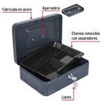 Caja de seguridad para dinero de 25 cm con charola extraíble de 3 servicios. Fabricada en acero, con charola plástica. Ancho: 25 cm. Alto: 9 cm. Profundidad: 18 cm. Incluye 2 llaves. HERMEX