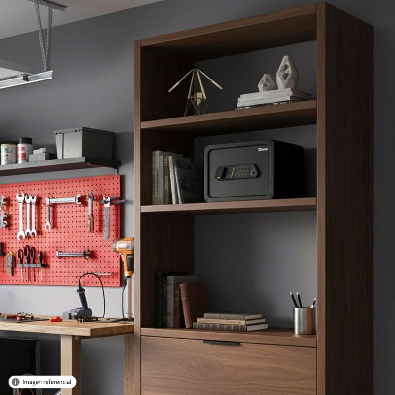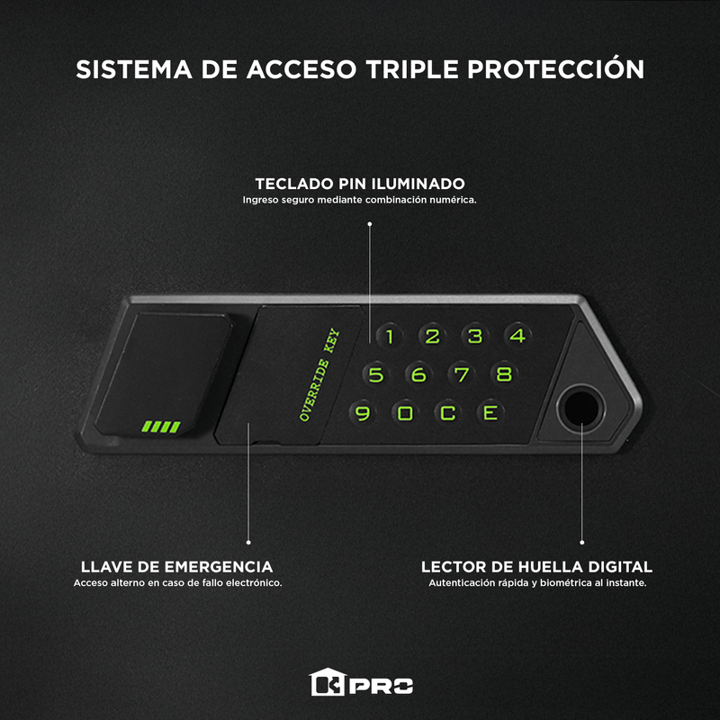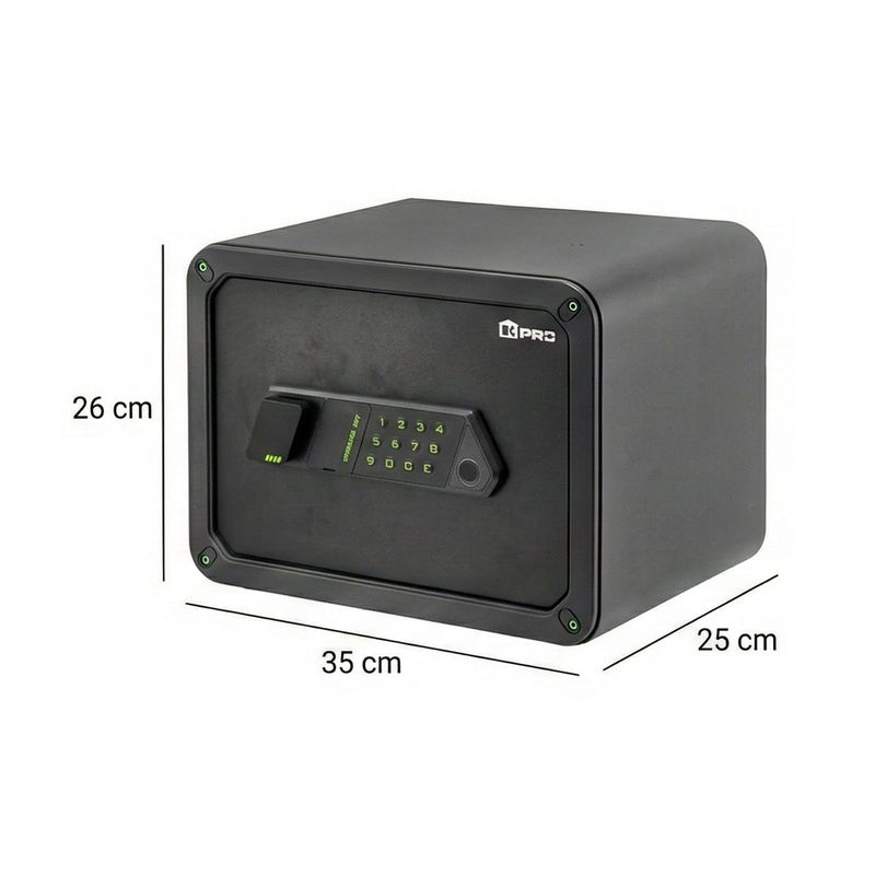 Caja fuerte digital con seguridad de huella dactilar y tamaño de 25 cm. Diseñada para ofrecer seguridad de vanguardia. Su avanzado sistema de desbloqueo por huella dactilar permite un acceso rápido y exclusivo para el usuario, combinando la fiabilidad de la cerradura electrónica con la tecnología biométrica más eficiente, ideal para proteger documentos importantes, joyas o dinero en efectivo de forma discreta y robusta. Ⓘ Imágenes referenciales. Medidas del producto (Alt+Anch+Prof): 26 x 35 x 25 cm K PRO