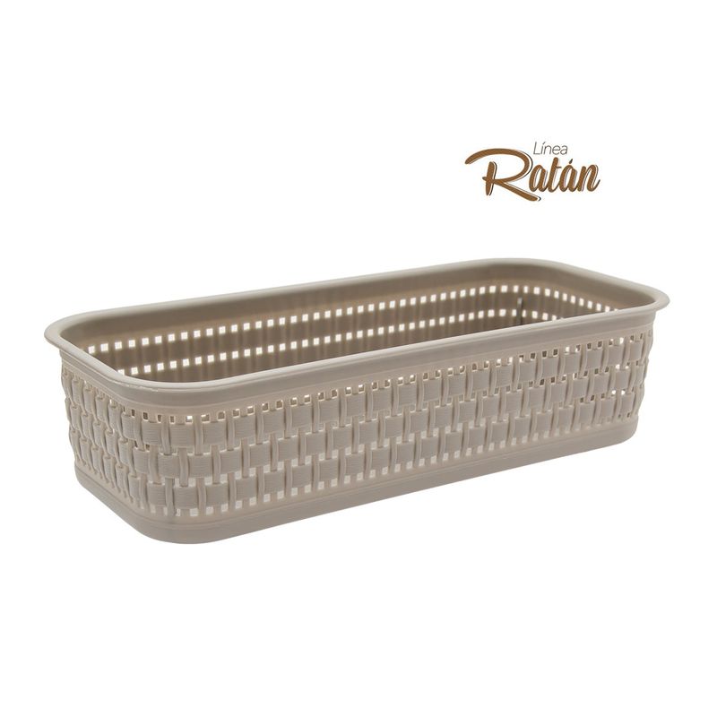 Canastilla Ratan Chic sin tapa Mediano beige oscuro. La canastilla Chic contiene un diseño ratán, elaborada en plástico con protección solar UV, el cual lo hace resistente a los rayos solares, a la humedad y al polvo. Medidas del producto (Alt+Anch+Prof): 7 x 11,7 x 26,5 cm CASA PICA
