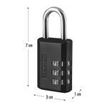 Candado de COMBINACIÓN de 3 dígitos, apto para para establecer y restablecer la clave. Protege lo que más valoras con el candado de combinación: su cuerpo de metal negro de 30 mm y arco de acero resistente al corte ofrecen máxima seguridad, mientras que su combinación de 3 dígitos es fácil de configurar y resetear. Compacto, duradero y confiable, combina resistencia y practicidad en un diseño elegante. Ideal para lockers, mochilas o casilleros. Medidas del producto (Alt+Anch+Prof): 7 x 3 x 1 cm MASTER LOCK