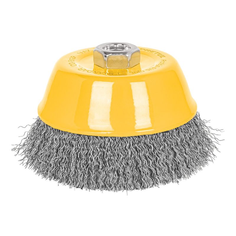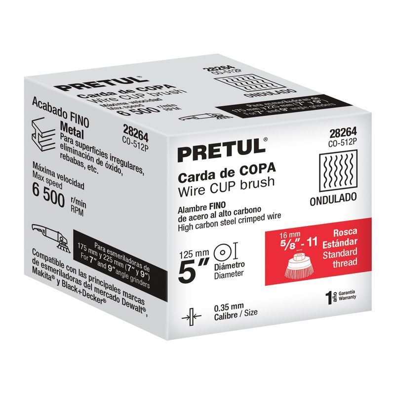 Cepillo de copa de 5" alambre fino ondulado con eje de 5/8"-11. Alambre ondulado para limpieza de superficies metálicas, eliminación de óxido y preparación para soldadura. Fabricada en acero al carbono. Acabado fino. Compatibles con esmeriladoras Truper® y Pretul®. Medidas del producto (Alt+Anch+Prof): x x cm PRETUL