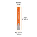 Cincel de corte frío de 1" (25 mm) x 8" (200 mm) de acero al cromo vanadio. Cabeza grande que incrementa el área de impacto y filo endurecido para mayor resistencia. Ideal para cortar o ranurar metales. Medidas del producto (Alt+Anch+Prof): x x cm TRUPER