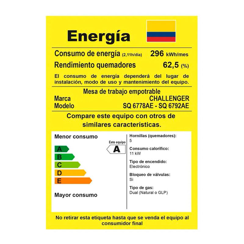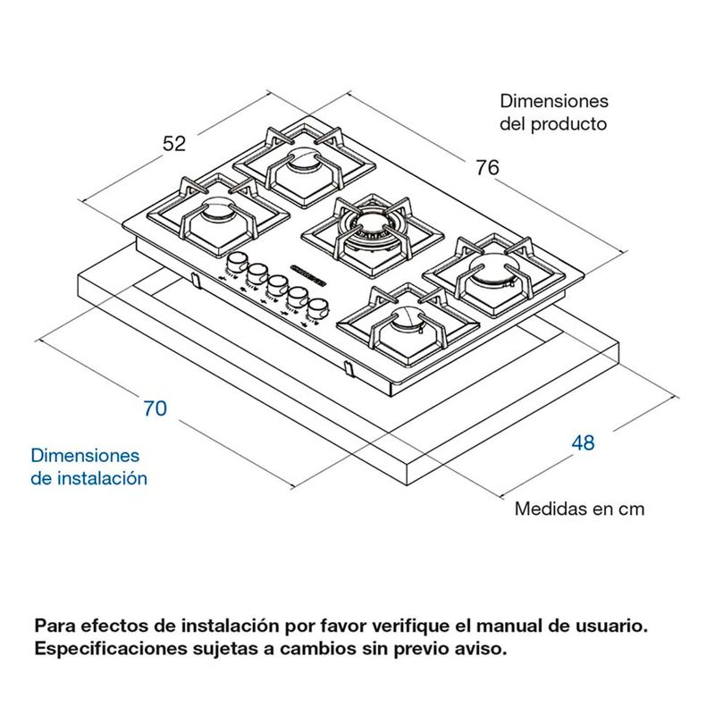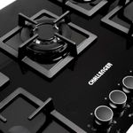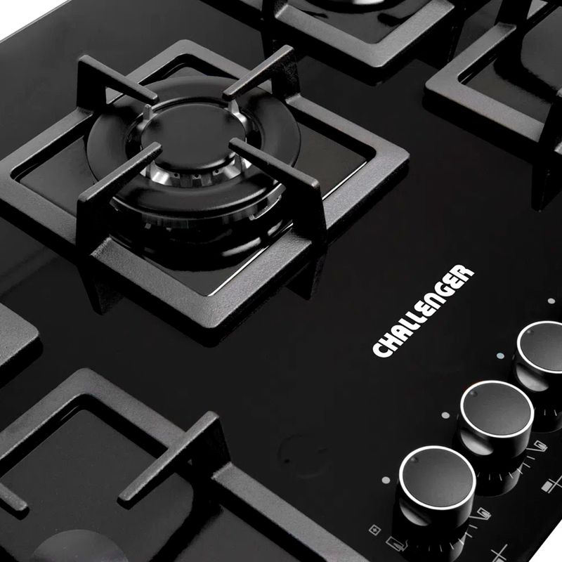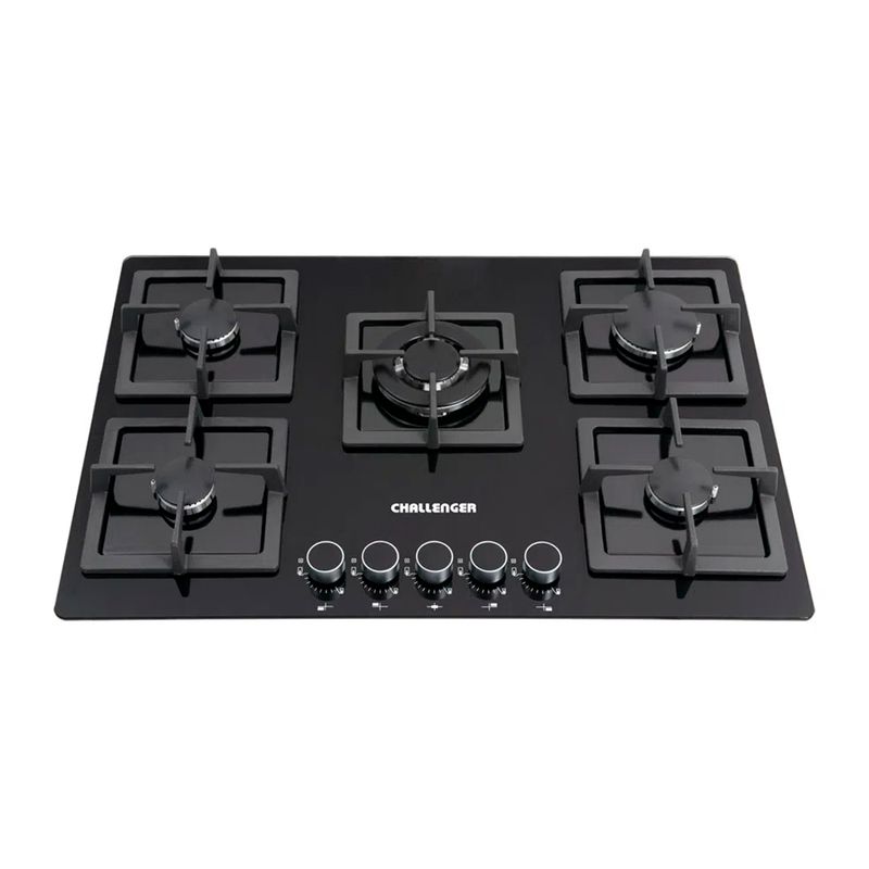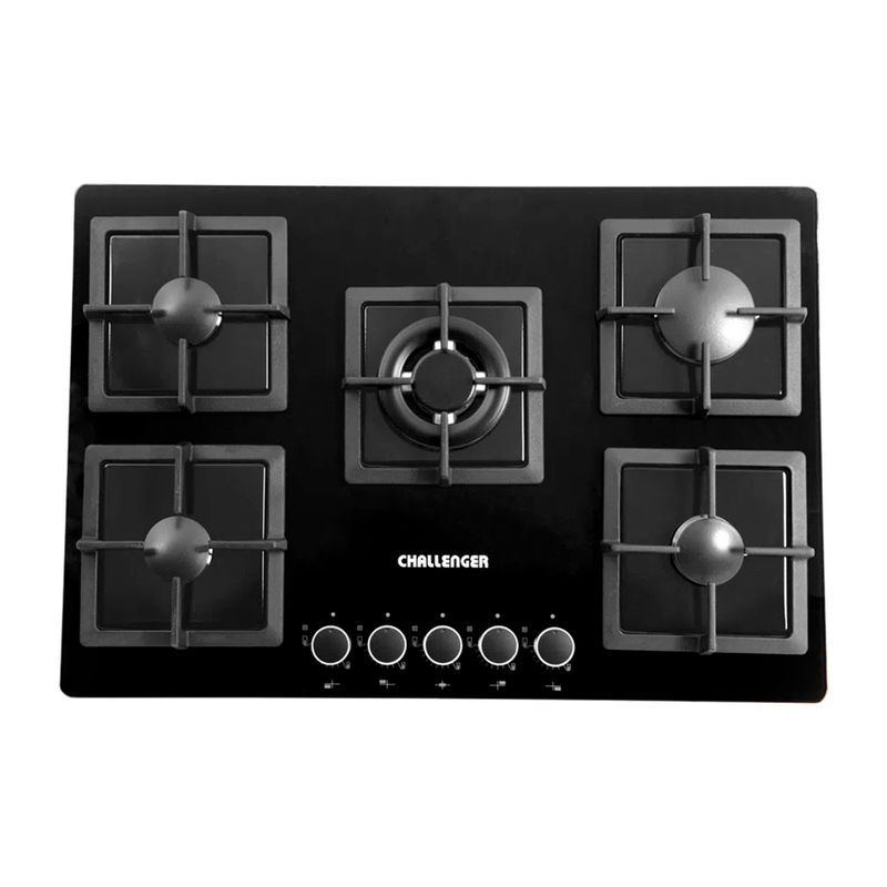 Encimera 5 Quemadores. Perillas metálicas que garantizan una mayor vida útil. Parrillas en hierro fundido con soportes antideslizantes de alta resistencia a la temperatura que garantizan una mayor seguridad. Encendido electrónico. Empaques anti-derrames de alta resistencia al calor que evitan filtraciones hacia el interior de la cocina y protegen el cristal. Medidas del producto: 5 x 76 x 52 cm. Peso: 16,2 kg. CHALLENGER