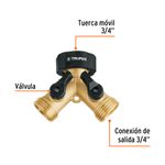 Conector en "Y" de latón sólido de 2 vías de 3/4". Permite ajustar o cerrar el flujo de agua en cada conexión de la manguera. Fabricado en latón sólido con tuerca móvil y válvulas de cierre de 1/4 de vuelta. Medidas del producto (Alt+Anch+Prof): 12,2 x 8,1 x 5 cm TRUPER