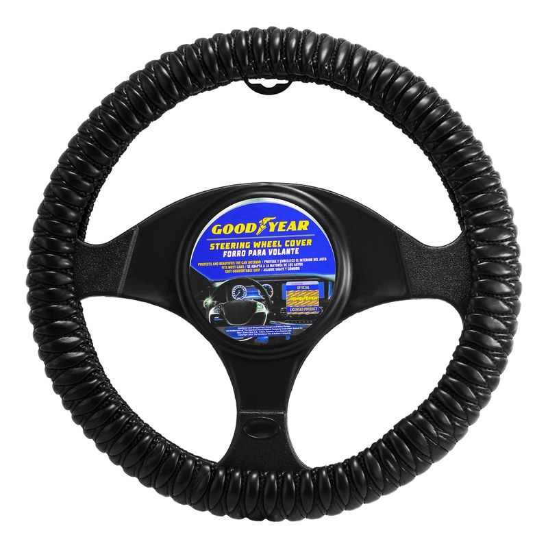 Cubre volante negro con texturizado de relieve. Diseñado para brindar un agarre superior, comodidad y estilo sofisticado. Su acabado antideslizante asegura seguridad en cada maniobra, mientras que el diseño elegante y moderno mejora instantáneamente la apariencia interior de tu vehículo. Fácil de instalar y resistente al uso diario, es el accesorio perfecto para quienes buscan practicidad y un toque de distinción al conducir. Medidas del producto (Alt+Anch+Prof): 38,5 x 38,5 x 3,5 cm GOODYEAR