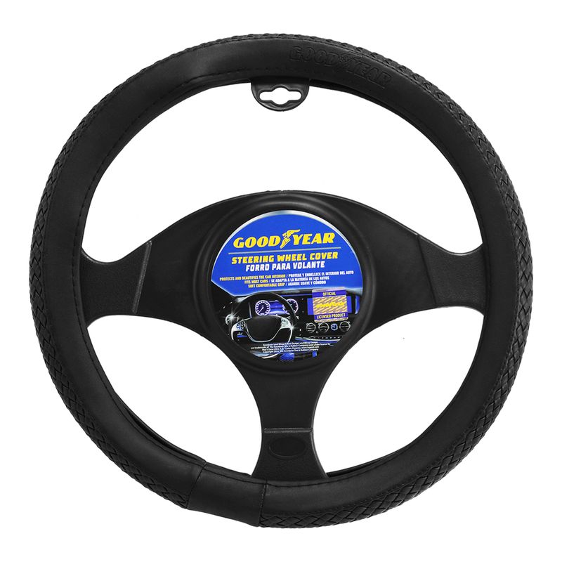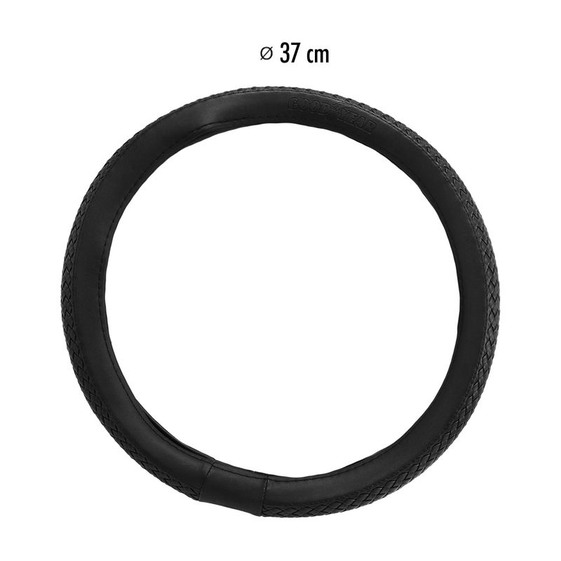 Cubre volante color negro con diseño tejido. Adaptable a cualquier volante. Combina estilo y comodidad en cada detalle. Su material de alta calidad ofrece un agarre firme y suave al tacto, mientras que su diseño moderno realza el look del volante, protegiéndolo del desgaste y manteniéndolo siempre impecable. Ideal para conducir con seguridad y elegancia todos los días. Medidas del producto (Alt+Anch+Prof): 37 x 37 x 3 cm GOODYEAR