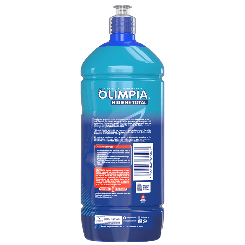 Desinfectante en gel HIGIENE TOTAL 3 en 1 con fragancia herbal 1000 ml. Fórmula avanzada diseñada para una limpieza y desinfección profunda en tu hogar. Elimina eficazmente el 99.9% de las bacterias, incluyendo E. Coli, S. Aureus, y el virus de la Influenza AH1N1. Ideal para la limpieza de pisos, baños y cocinas, dejando un agradable y duradero aroma a frescura herbal. Su poder desinfectante garantiza un ambiente más seguro y libre de gérmenes para toda tu familia. OLIMPIA