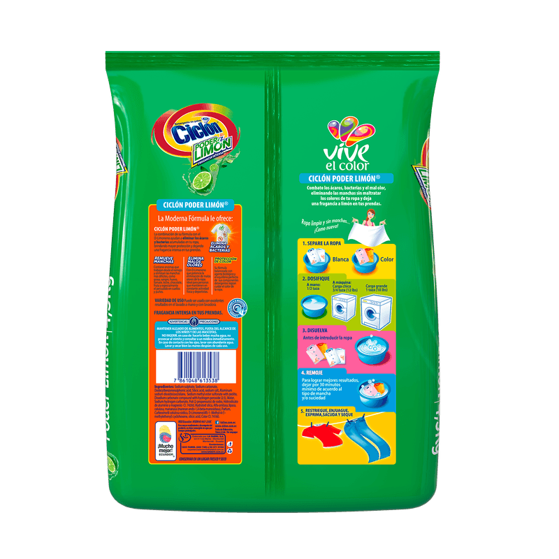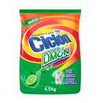 Detergente en polvo "Poder Limón" con fragancia intensa en presentación de 4,5 kg. Ideal para eliminar ácaros y bacterias mientras cuida tu ropa y protege a tu familia. Su fragancia intensa a limón neutraliza los malos olores, y su agente biológico ayuda a conservar los colores vivos por más tiempo. Remueve con eficacia manchas difíciles como grasa, sangre, vino, chocolate y más, dejando tus prendas limpias, frescas y como nuevas. Además, combate el percudido en cuellos y puños y es suave con los tejidos. Medidas del producto (Alt+Anch+Prof): 41,5 x 32 x 20 cm CICLÓN