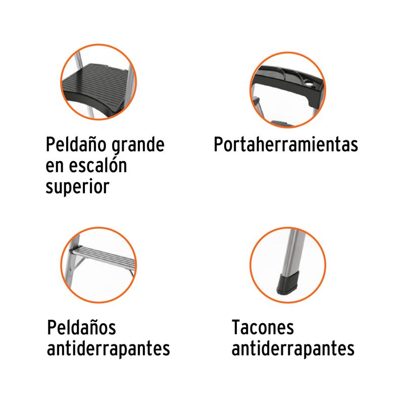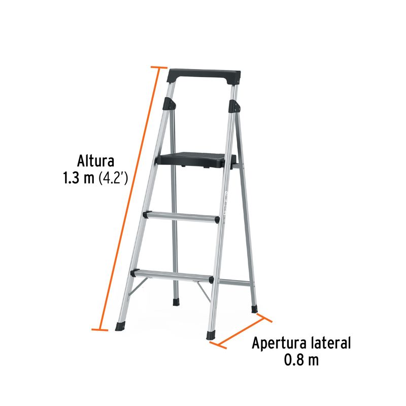 Escalera tubular plegable de aluminio con 3 peldaños; Soporta hasta 150 kg. Diseño ligero y resistente que facilita su almacenamiento y transporte. Cuenta con bloqueo de seguridad, plataforma y tacones antiderrapantes. Medidas del producto (Alt+Anch+Prof): x x cm TRUPER