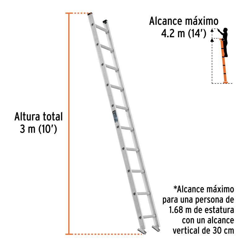 Escalera recta de 8 peldaños, tipo III de 2,4 m de aluminio con peldaños y tacones antiderrapantes. Diseñada para uso comercial. Proporciona un alcance máximo de 4,2 m (14'). Escalera recta resistente a la intemperie y al impacto. Ideal para trabajos de mantenimiento, construcción, pintura y tareas domésticas. Cuenta con peldaños en "D" antiderrapantes, patas antiderrapantes y refuerzo en la unión de los peldaños para mayor estabilidad y seguridad. Ademas, incluye zapatas articuladas para un mejor apoyo y seguridad. *Alcance máximo para una persona de 1.68 m de estatura con un alcance vertical de 30 cm. Soporta hasta 150 kg. Medidas del producto (Alt+Anch+Prof): 240 x x cm TRUPER
