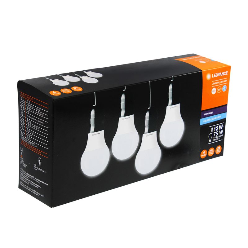 Foco LED de 12W con luz blanca, 4 unidades. Ideales para interiores gracias a su luz blanca de 6500K que brinda confort y armonía. Con boquilla E27, 1018 lúmenes de potencia y voltaje universal (120-240V), ofrecen hasta un 85% de ahorro energético y una durabilidad de 25 años (25.000 horas de uso). Eficientes, resistentes y confiables, son la opción perfecta para quienes buscan calidad y economía en cada espacio. Medidas del producto (Alt+Anch+Prof): 12 x 6 x 6 cm LEDVANCE
