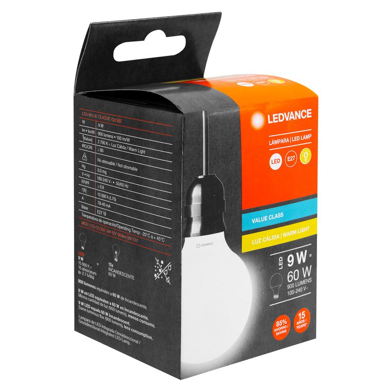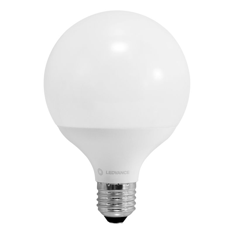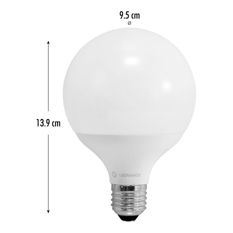 Foco LED "Globe" de 9 W de potencia con luz cálida de 2700 K. Equivalente a 60 W incandescente, que brinda una cálida luz de 2700 K y 900 lúmenes para un ambiente acogedor y eficiente. Con rosca estándar E27, funciona en un rango de 100-240 V, ideal para interiores, ofreciendo hasta 15.000 horas de durabilidad con un consumo mínimo de energía. Medidas del producto (Alt+Anch+Prof): 13,9 x 9,5 x 9,5 cm LEDVANCE