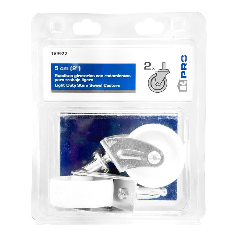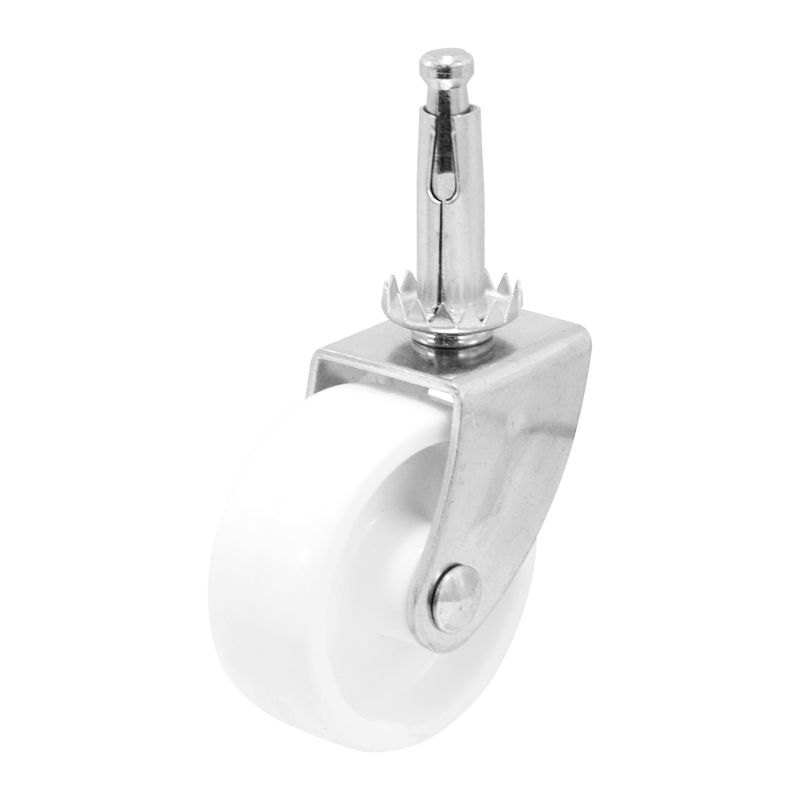 Garrucha de 2" de polipropileno blanco con espiga para cargas de 27 kg Pack x 2. Ligeras y funcionales, perfectas para trabajos de bajo esfuerzo. Equipadas con ruedas giratorias de alta calidad y rodamientos para un desplazamiento suave y eficiente. Fabricadas en plástico resistente, estas garruchas soportan una capacidad de carga de hasta 27 kg, siendo ideales para mover objetos pequeños con facilidad. Medidas del producto (Alt+Anch+Prof): 10 x 2,8 x 5,5 cm K PRO