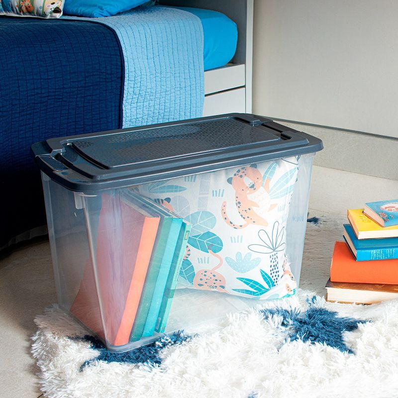 Guardamovil Briko con tapa gigante gris oscuro. Guardamóvil transparente gigante multiusos con tapa de cierre semi hermético, incluye ruedas para facil movilización. Medidas del producto (Alt+Anch+Prof): 43 x 42,7 x 67 cm CASA PICA