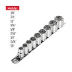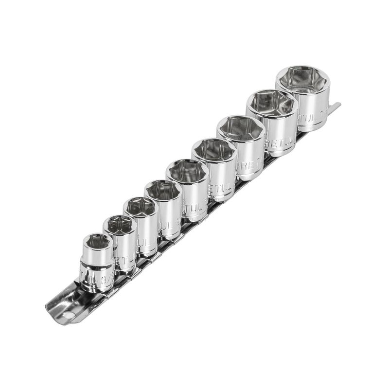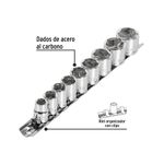 Juego de 9 dados ESTÁNDAR con cuadro 3/8" de 6 puntas. Forjados en acero al carbono con acabado en cromo para resistir la corrosión. Medidas marcadas para fácil identificación. Incluye riel organizador. Medidas del producto (Alt+Anch+Prof): x x cm PRETUL