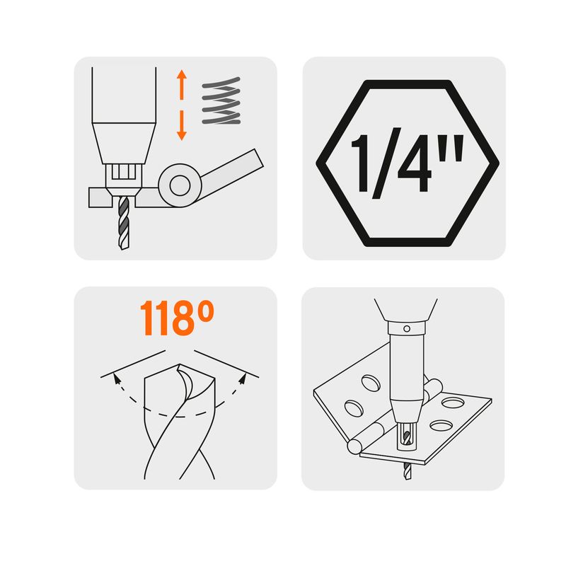 Juego de 3 brocas para bisagra de acero HSS con zanco hexagonal de 1/4". Incluye broca guía retráctil para centrado. La solución perfecta para instalar herrajes con precisión profesional. Cada broca cuenta con una guía retráctil que se alinea con el orificio de la bisagra, garantizando una perforación piloto siempre centrada y evitando que la madera se parta. Su zanco hexagonal de 1/4" es compatible con taladros y destornilladores de impacto para un cambio rápido, siendo ideal para carpinteros. Medidas del producto (Alt+Anch+Prof): x x cm TRUPER