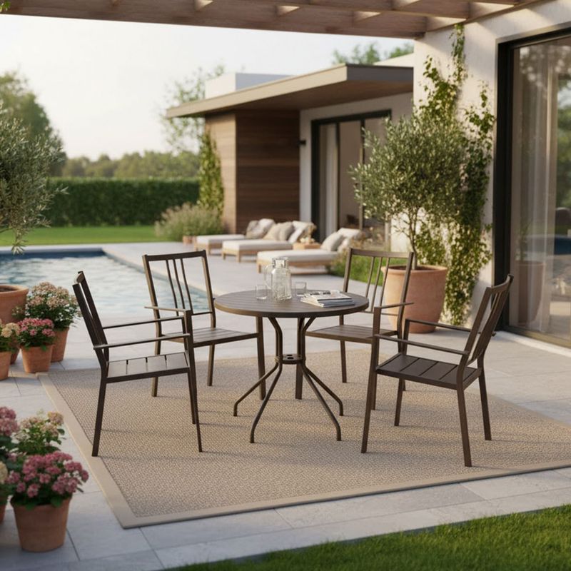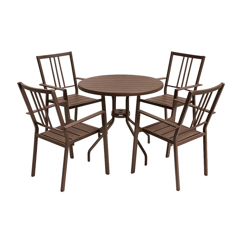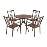 Juego de mesa con sillas con estructura de acero y apliques plásticos. Diseño MADERADO con 4 sillas y 1 mesa redonda. Juego de mesa perfecto para armonizar y decorar todo tipo de ambientes exteriores como: patios, jardines, jardines zen, terrazas, plazas comerciales, etc. Medidas del producto (Alt+Anch+Prof): 89 x 112 x 134 cm ORGILL
