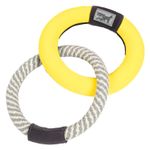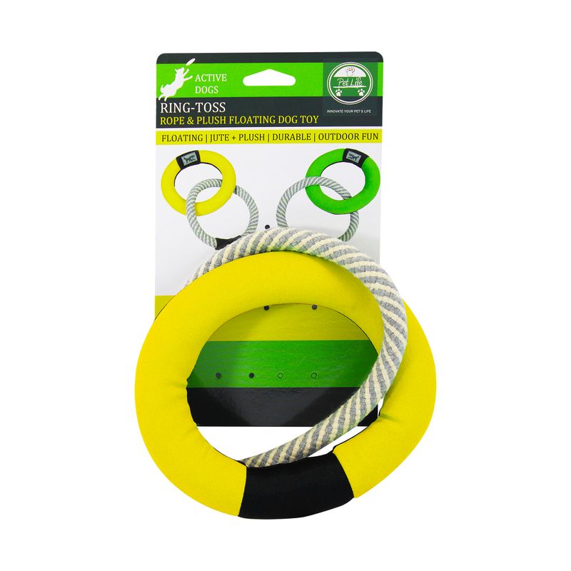 Juguete amarillo para perros con diseño de anillos entrelazados. Diseñado para diversión en tierra y agua. Este resistente juguete combina una cuerda de yute de alta calidad con un anillo flotante de espuma, perfecto para juegos de lanzamiento, arrastre y aventuras acuáticas. Su construcción duradera con costuras reforzadas garantiza horas de juego seguro, mientras que su diseño versátil ayuda a canalizar la energía de perros activos, promoviendo ejercicio y diversión al aire libre. Ligero y fácil de usar, es el compañero ideal para cualquier rutina de juego. Medidas del producto (Alt+Anch+Prof): 3 x 27 x 18 cm PET LIFE