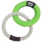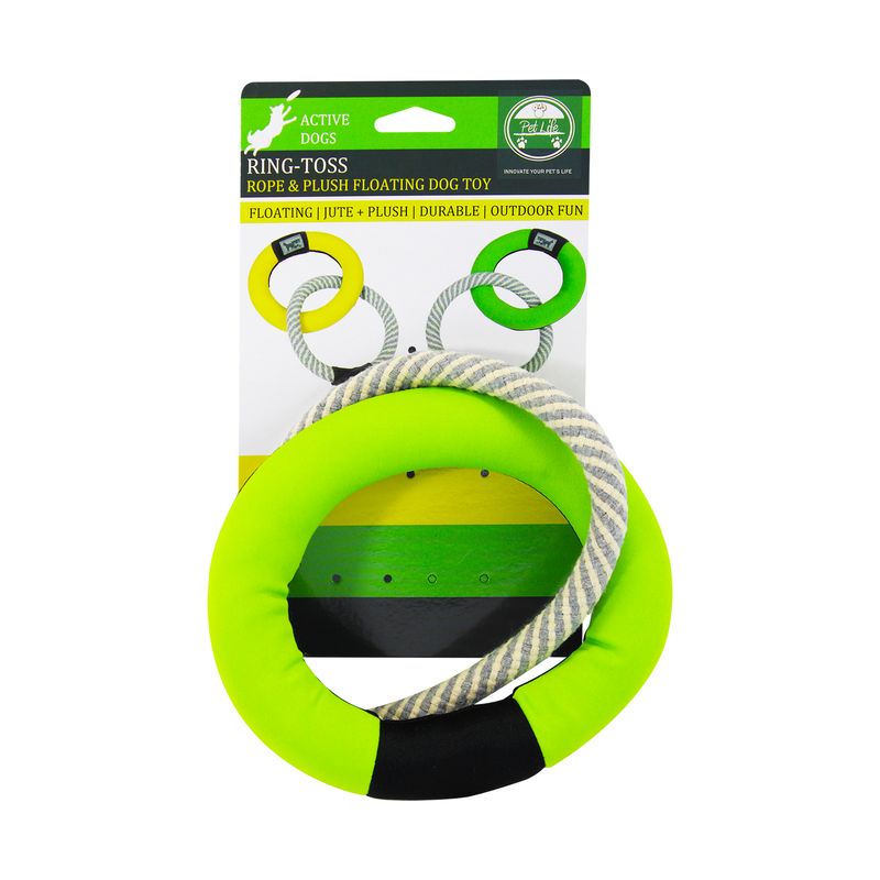 Juguete verde para perros con diseño de anillos entrelazados. Diseñado para diversión en tierra y agua. Este resistente juguete combina una cuerda de yute de alta calidad con un anillo flotante de espuma, perfecto para juegos de lanzamiento, arrastre y aventuras acuáticas. Su construcción duradera con costuras reforzadas garantiza horas de juego seguro, mientras que su diseño versátil ayuda a canalizar la energía de perros activos, promoviendo ejercicio y diversión al aire libre. Ligero y fácil de usar, es el compañero ideal para cualquier rutina de juego. Medidas del producto (Alt+Anch+Prof): 3 x 27 x 18 cm PET LIFE