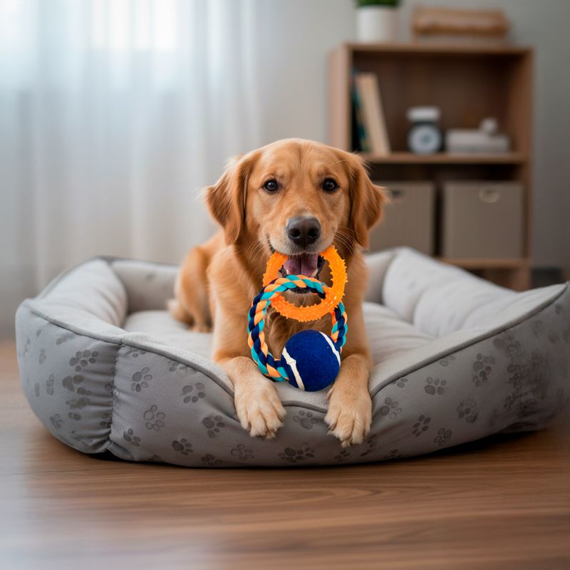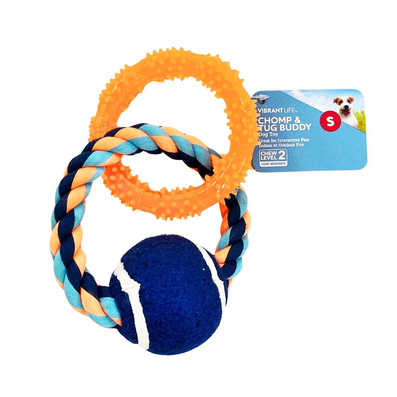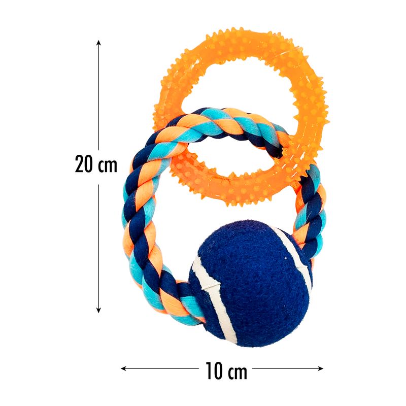 Juguete para perro, pelota de tenis con 2 aros de caucho y fibra de lana, colorido. ¡Dale a tu pequeño amigo horas de diversión. Este juguete interactivo combina un anillo TPR con suaves nudos para masajear encías, una cuerda trenzada resistente para juegos de tira y afloja, y una pelota de tenis duradera para perseguir y atrapar. Perfecto para interiores y exteriores, mantiene a tu perro activo, feliz y conectado contigo en cada juego. Ideal para razas pequeñas y mordedores ligeros. Medidas del producto (Alt+Anch+Prof): 20 x 10,5 x 10,5 cm VIBRANT LIFE