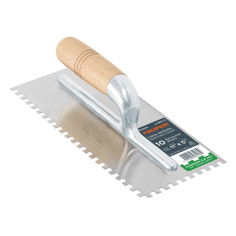 Llana de 11" x 5" con dentado cuadrado de 1/4" con hoja de acero y mango de madera. Llana con hoja de acero de alta resistencia y mango de madera, diseñada para la aplicación y extendido de mortero y otros materiales de construcción con un acabado liso. Marco de aluminio pulido espejo para fácil limpieza. Mango de madera pulido y laqueado que evita el desgaste. Especial para la aplicación de cementos o adhesivos en la colocación de cerámica y piedra, permitiendo la salida de aire para un mayor agarre y mayor duración. Medidas del producto (Alt+Anch+Prof): x x cm TRUPER
