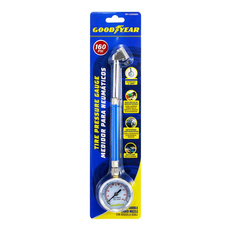 Medidor de aire con manguera y manómetro de hasta 160 Psi. Ideal para inflar y controlar la presión de neumáticos en autos, motos y bicicletas. Su diseño portátil y fácil de usar garantiza lecturas claras y exactas, brindando seguridad y eficiencia en cada uso. Medidas del producto (Alt+Anch+Prof): 26,5 x 5,5 x 2,5 cm GOODYEAR