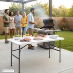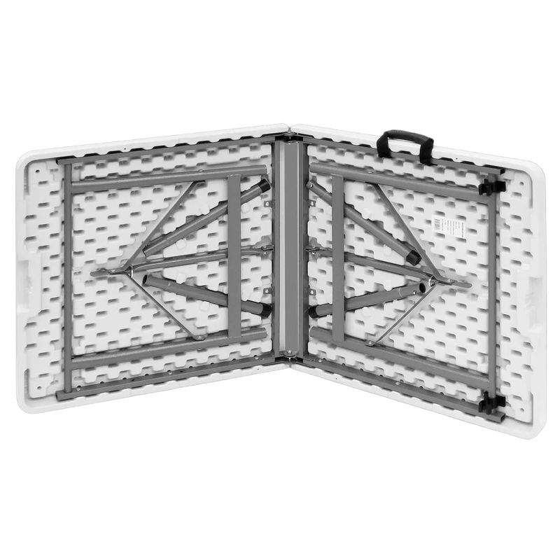 Mesa plástica, plegable, para uso en interiores o exteriores. Acabado blanco. Estructura metálica. Patas desmontables para uso como mesa de centro.