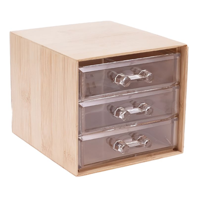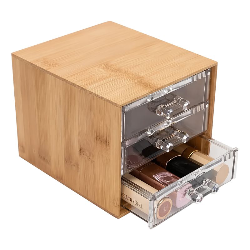 Organizador de maquillaje con cuerpo de bambú y cajones plásticos. Su estructura de bambú natural aporta un toque cálido y moderno, mientras que sus 3 cajones de plástico transparente permiten visualizar fácilmente tus cosméticos, brochas y accesorios. Ideal para optimizar el espacio y mantener todo al alcance de la mano, este organizador combina funcionalidad, resistencia y diseño en una sola pieza. Medidas del producto (Alt+Anch+Prof): 11 x 12 x 14 cm ELEGANZA