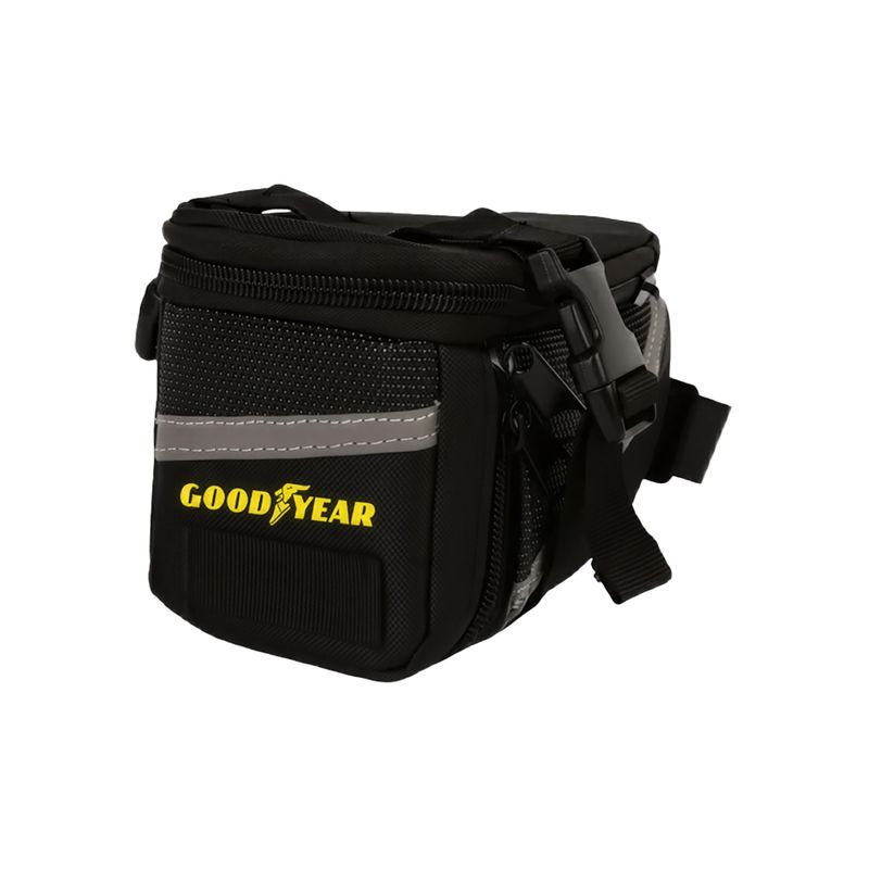 Bolsa organizadora con cierre y bandas ajustables para bicicleta. Diseñada para instalarse debajo del asiento con total seguridad gracias a sus bandas ajustables y cierre resistente. Compacta y práctica, te permite llevar tus objetos esenciales como llaves, herramientas o documentos siempre a la mano, sin ocupar espacio adicional en tu recorrido. Ideal para ciclistas que buscan comodidad y organización en cada viaje. Medidas del producto (Alt+Anch+Prof): 11 x 16 x 11 cm GOODYEAR