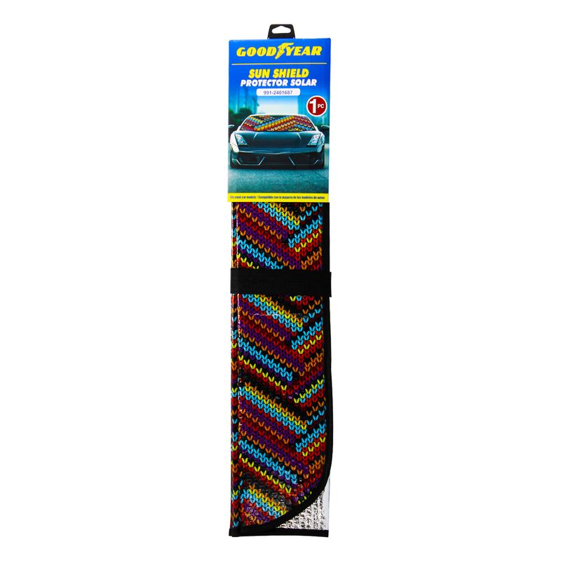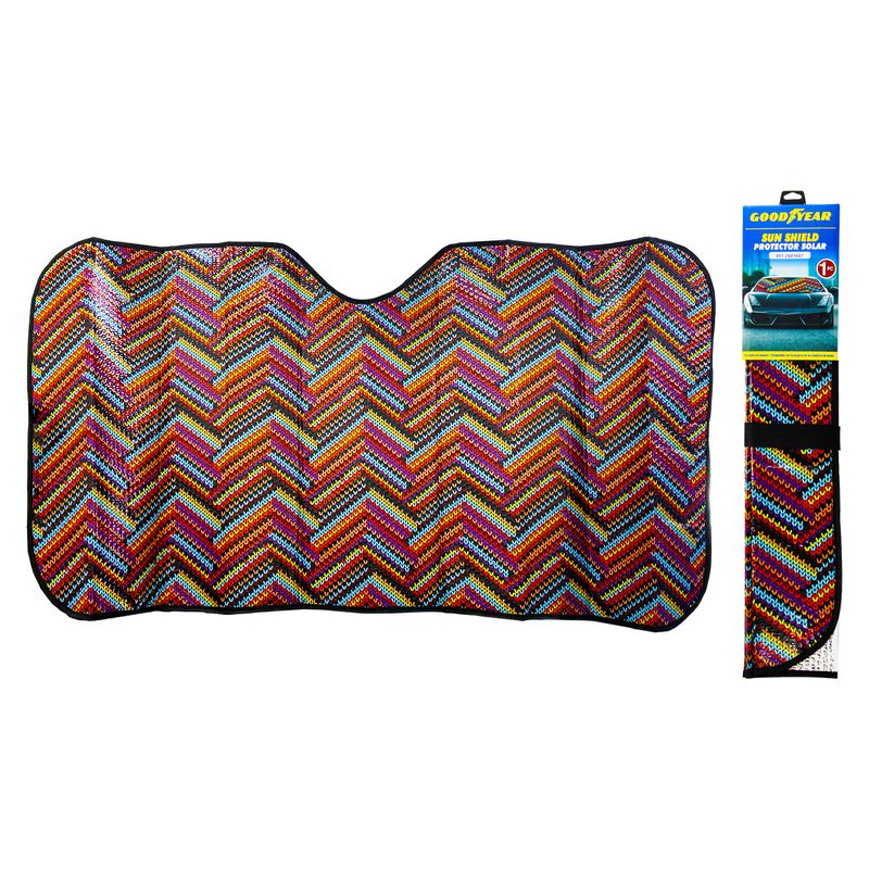 Parasol para auto de 140 x 70 cm con diseño de colores. Diseñado para mantener el interior fresco y prevenir daños en el tablero y los asientos. Su llamativo diseño de colores no solo brinda funcionalidad, sino que también aporta un toque moderno y divertido a tu vehículo, fácil de colocar y guardar cuando no lo uses. Ideal para cualquier conductor que busque combinar protección y estética. Medidas del producto (Alt+Anch+Prof): 70 x 140 x 0,7 cm GOODYEAR