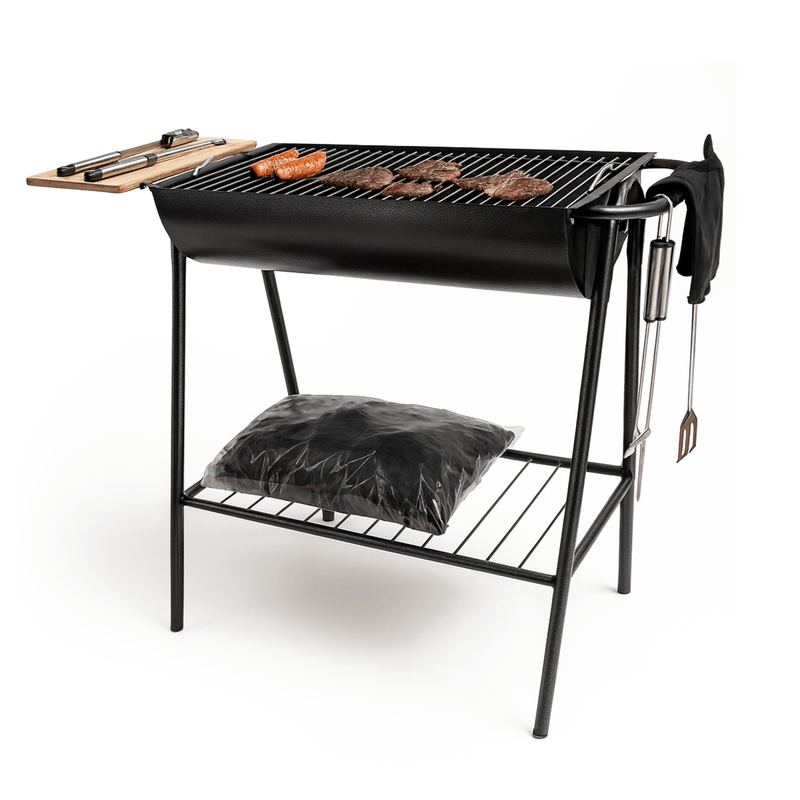 Parrilla para carbón cilindro mediano. Medidas: 60x32x83cm. Parrilla en acero inoxidable. Color: Plata texturizado
