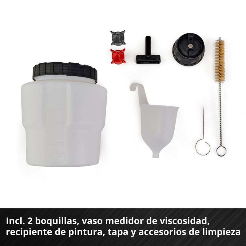 Pistola de pintura inalámbrica de 18V con capacidad de 800 ml y flujo de 650 ml/min. El sistema de pulverización de pintura con batería TC-SY 18/60 Li-Solo de Einhell es apropiado para pulverizar barnices y esmaltes, detergentes e impregnantes y aceites. El sistema de mano es apropiado para superficies de trabajo pequeñas y medias, mediante el agarre suave puede manipularse la pistola pulverizadora de forma segura y cómoda,El motor impulsa hasta 650 ml/min por el cabezal de aire ajustable para chorro en vertical, horizontal y circular, el cabezal pulverizador es desmontable para la limpieza de todos los elementos de transporte de pintura. Regulación de cantidad de pintura integrada sirve para la adaptación ideal de la aplicación de pintura. Para la conservación ahorrando espacio, en la carcasa está colocado un dispositivo de suspensión. El envío se realiza incluyendo 2 boquillas para diferentes viscosidades de barniz y esmalte y recipiente de 100 ml para el examen de viscosidad, cepillo de limpieza para limpiar el tubo ascendente y aguja de limpieza para limpiar la boquilla pulverizadora, así como un recipiente de pintura de 800 ml con escala de medición y una tapa adecuada. Medidas del producto (Alt+Anch+Prof): 160 x 270 x 240 cm EINHELL