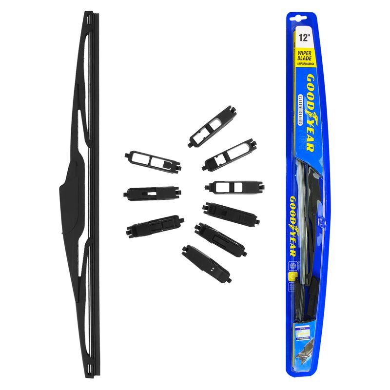 Pluma limpia parabrisas trasera de 12" color negro universal. Su instalación sencilla y ajuste compatible con la mayoría de autos garantiza un desempeño eficiente, eliminando agua, polvo y suciedad de manera rápida y uniforme. Duradera y confiable, es el accesorio perfecto para mantener tu parabrisas trasero siempre limpio y claro, incluso en condiciones climáticas adversas. Medidas del producto (Alt+Anch+Prof): 4,5 x 30,5 x 1,5 cm GOODYEAR