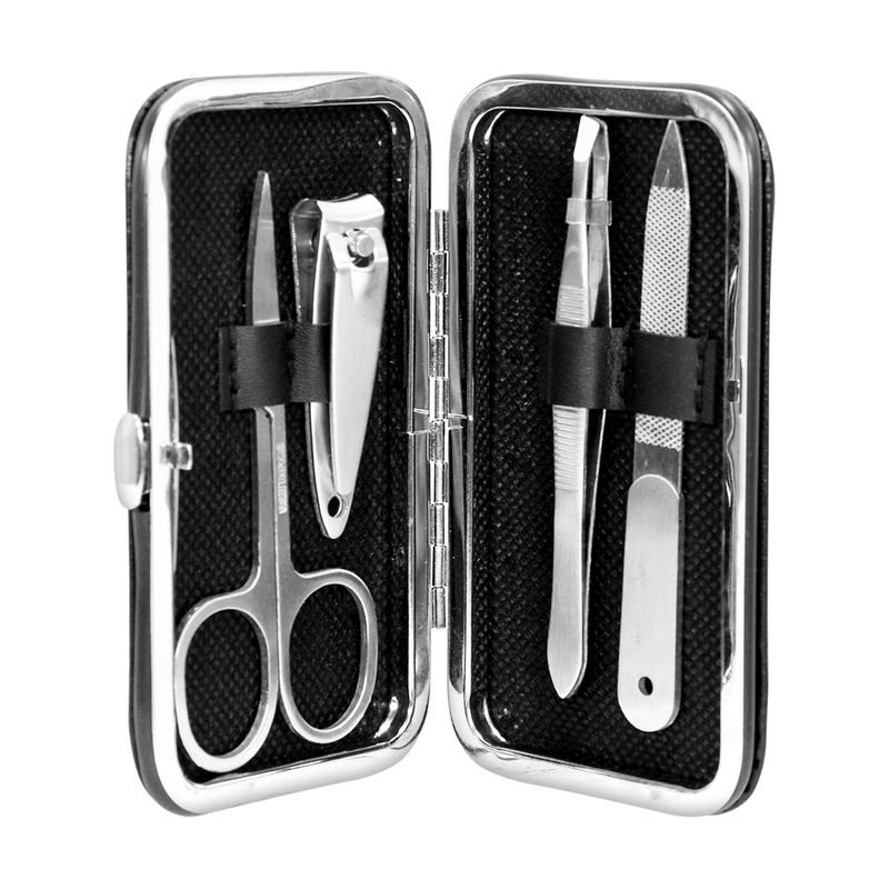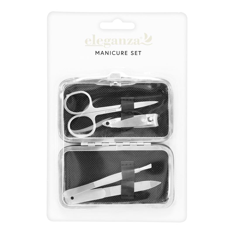 Set de manicura con estuche organizador. Incluye tijera, cortaúñas, pinza de cejas y lima de uñas, todo dentro de un elegante estuche organizador. Ideal para el hogar o para llevar en la bolsa, este kit compacto combina funcionalidad y estilo para tu cuidado personal diario. Medidas del producto (Alt+Anch+Prof): 2 x 11 x 6,8 cm ELEGANZA