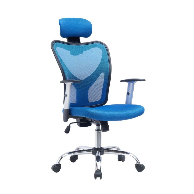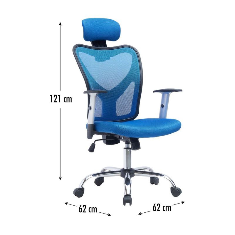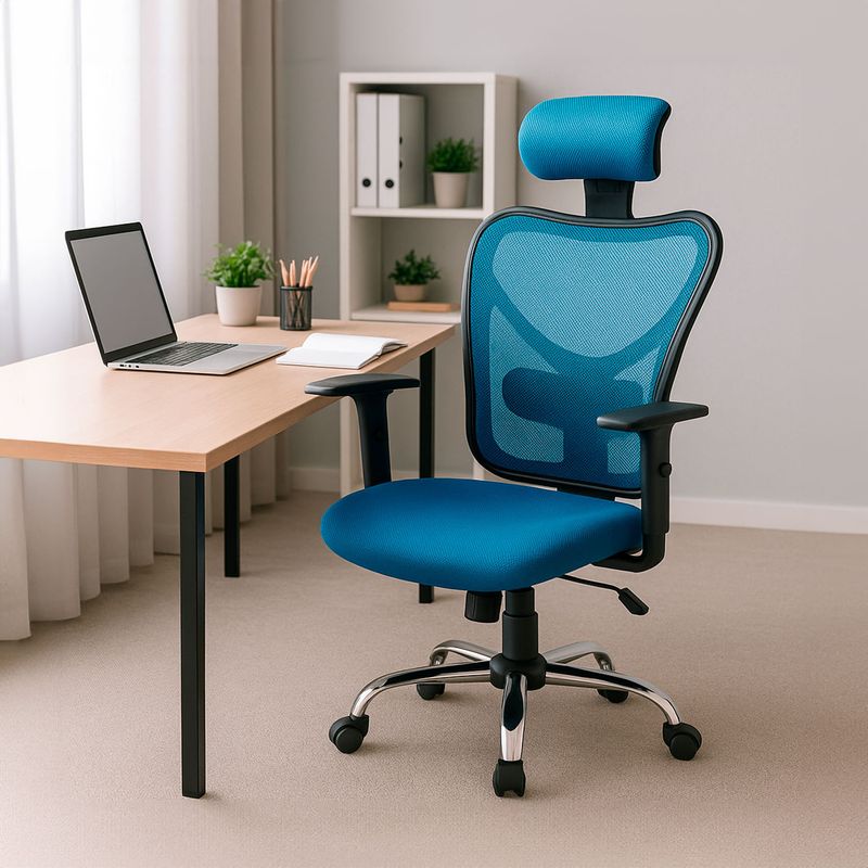 Silla para oficina con respaldo alto tipo malla color azul. Diseñada para brindar comodidad y soporte durante largas jornadas, esta silla cuenta con un respaldo alto de malla transpirable que favorece la ventilación y mantiene una postura ergonómica. Su diseño giratorio permite movilidad y libertad de movimiento, ideal para espacios de trabajo dinámicos. Perfecta combinación de confort, funcionalidad y estilo moderno para elevar tu productividad. Medidas del producto (Alt+Anch+Prof): 121 x 62 x 62 cm MAY'S
