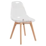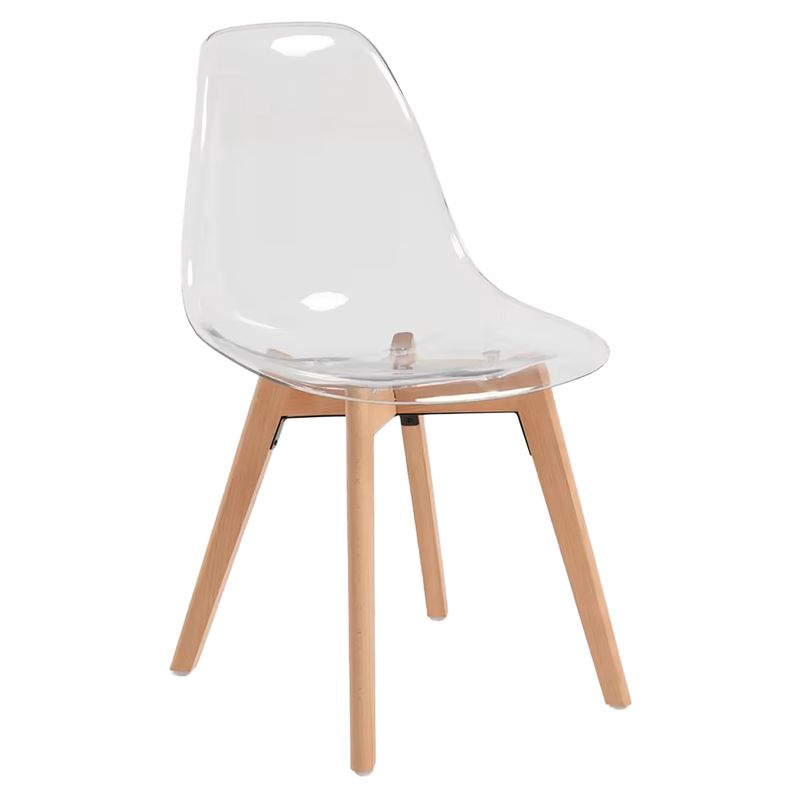 Silla transparente plástica con patas de madera. Fabricada en plástico transparente de alta resistencia con un diseño elegante que se adapta a cualquier ambiente. Sus patas de madera aportan estabilidad y un toque cálido, creando el equilibrio perfecto entre lo contemporáneo y lo natural. Ideal para comedores, oficinas o espacios decorativos que buscan estilo y funcionalidad en un solo producto. Medidas del producto (Alt+Anch+Prof): 78,5 x 45 x 50 cm WRT