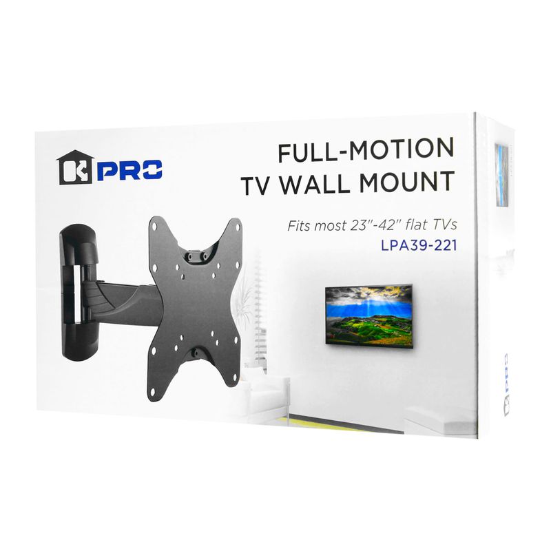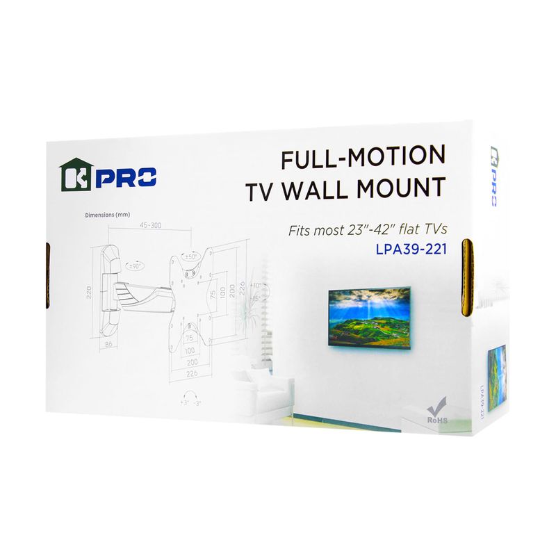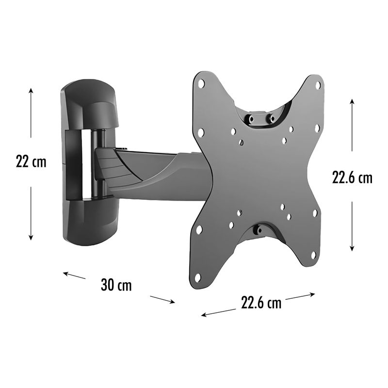 Soporte metálico tipo brazo de pared para televisiones. Diseñado para ofrecer flexibilidad y estilo. Su brazo extensible de hasta 300 mm permite girar la pantalla 90° a cada lado e inclinarla de -15° a +10°, logrando el ángulo perfecto de visión. Con gestión de cables integrada, cubiertas decorativas y ajuste de nivel de 3° para un montaje impecable, este soporte combina funcionalidad y elegancia. Compatible con orificios VESA de hasta 200x200, es la solución ideal para mantener tu televisor seguro, accesible y con un acabado ordenado. Medidas del producto (Alt+Anch+Prof): 22,6 x 22,6 x 30 cm K PRO