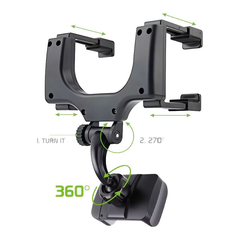 Soporte de celular con enganche para retrovisor de auto. Gracias a su enganche para retrovisor y su diseño 360° totalmente ajustable, podrás colocar tu teléfono en la posición perfecta para ver mapas, recibir llamadas o reproducir música de manera segura y cómoda. Compacto, resistente y fácil de instalar, es el accesorio ideal para mantener tu celular siempre a la vista sin comprometer tu seguridad al volante. Medidas del producto (Alt+Anch+Prof): 15,5 x 11,5 x 9 cm GOODYEAR