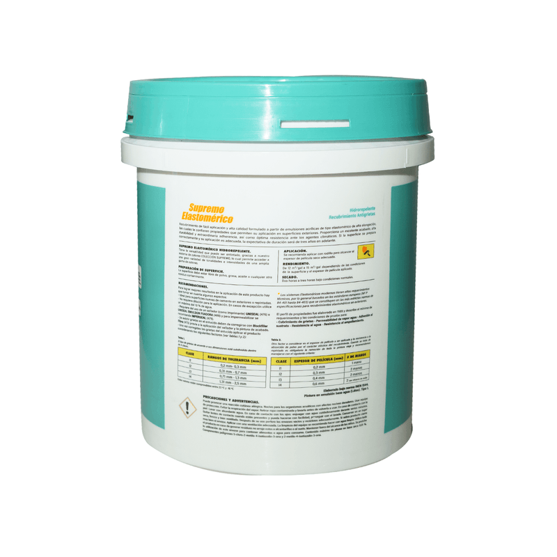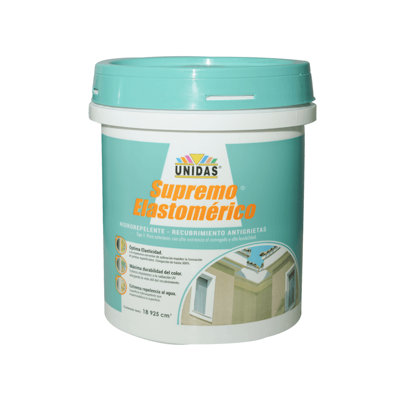Pintura elastomérica SUPREMO PREMIUM con efecto hidrorepelente Crema Rimini CANECA. Óptima elasticidad y alta elongación lo que permite acompañar el movimiento de dilatación y contracción de grietas sin generar fisuras en el acabado Elastomérico. El color es referencial y puede variar ligeramente del producto final. Medidas del producto (Alt+Anch+Prof): 37 x 35 x 37 cm PINTURAS UNIDAS
