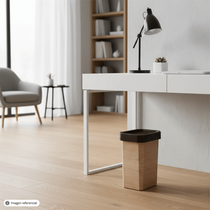 Tacho vaivén de 10 lt color café con diseño maderado. Ideal para almacenar y desechar residuos de manera cómoda y estética, su tapa vaivén facilita el uso diario, combinando funcionalidad y estilo para cualquier espacio del hogar u oficina. Medidas del producto (Alt+Anch+Prof): 35,6 x 26 x 19 cm ESTRA