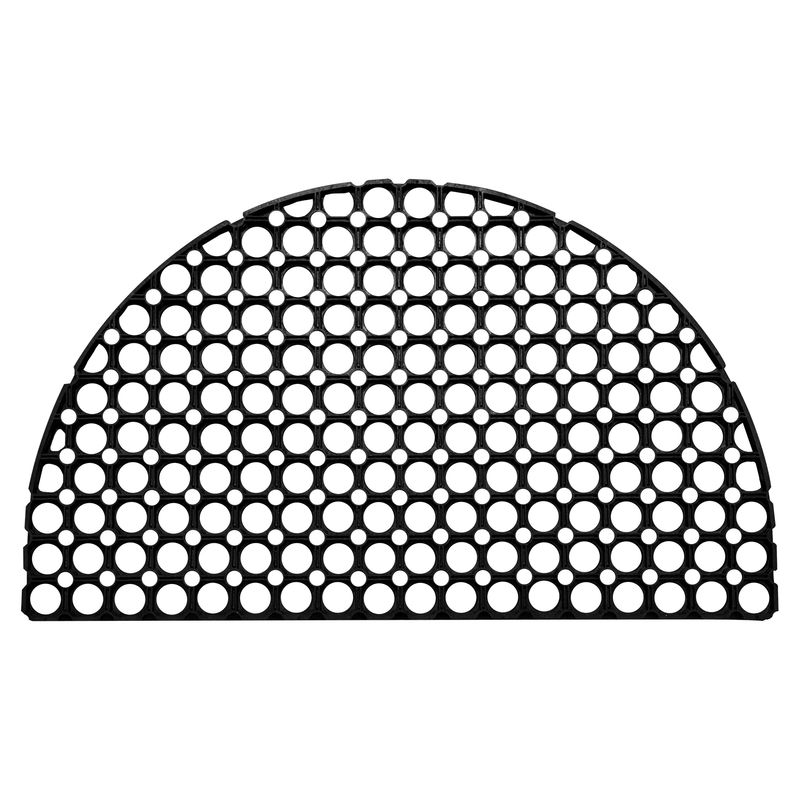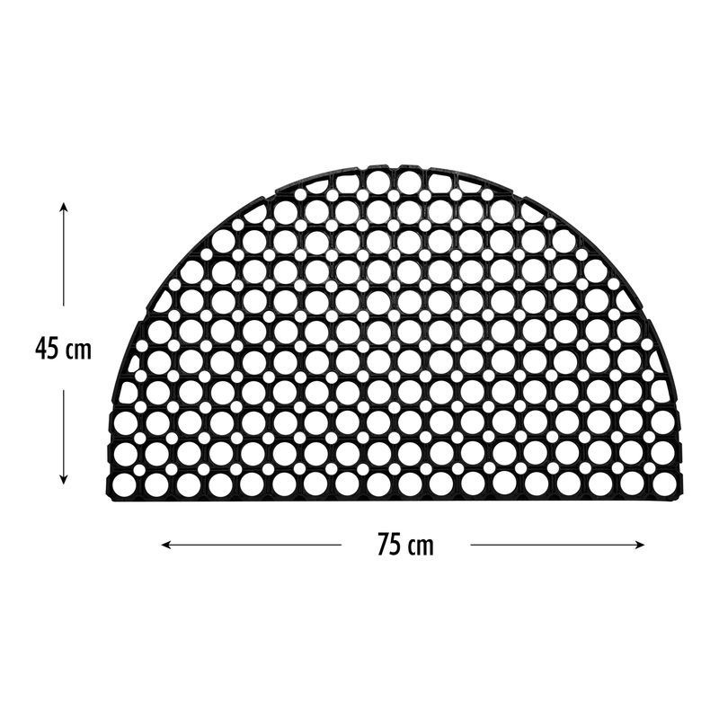 Tape de entrada semi circular en color negro para exterior. Diseñado para uso rudo en exteriores. Fabricado en caucho durable, soporta las condiciones más exigentes mientras mantiene su funcionalidad y estilo. Su diseño semi circular con perforaciones redondas no solo aporta un toque moderno y atractivo, sino que también facilita el drenaje del agua y la retención de suciedad, manteniendo limpias tus áreas interiores. Ideal para proteger tus pisos y ofrecer seguridad contra resbalones, este tapete combina resistencia, practicidad y estética en un solo producto. Medidas del producto (Alt+Anch+Prof): 2 x 75 x 45 cm SOHO CARPETS